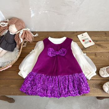 2026 Spring Autumn 1-5 Years Cute Little Girl Clothes Long Sleeve Mesh Top Bow Sequin Dress Two Piece Kids Clothing Set